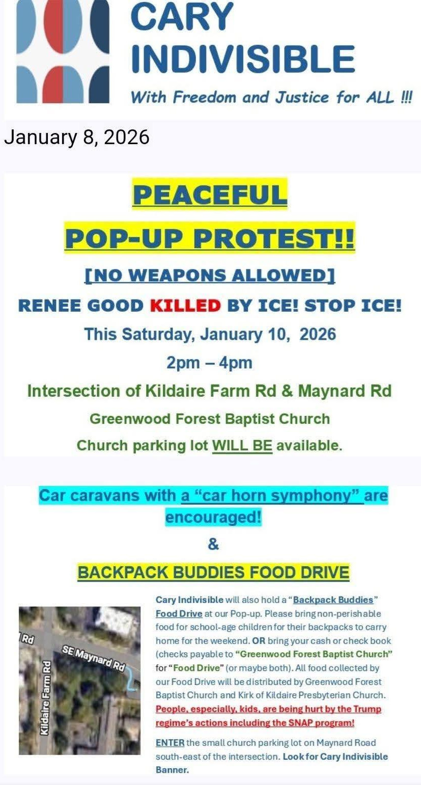 🚨 CARY (Saturday, Jan. 10th): Renee Good Killed by ICE! Stop ICE!